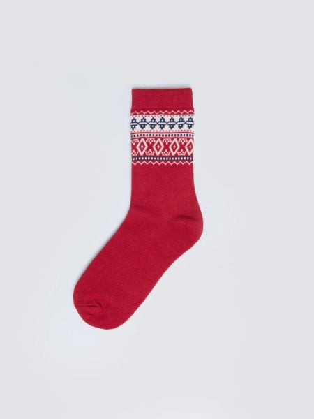 Dodaj energii zimowym dniom – długie, czerwone skarpetki z efektownym, żakardowym motywem skandynawskim. Wykonane z przędzy o wysokiej zawartości bawełny, są przyjemne w dotyku, ciepłe i oddychające. Intensywny odcień czerwieni wprowadzi świąteczny nastrój i ożywi każdą stylizację.