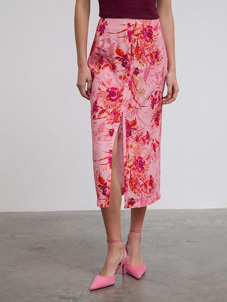 – czysta wiskoza- wysokość pasa: high waist- zapięcie: boczny suwak- dolny brzeg: z rozcięciem- krój: prosty- wzór: kwiatowyUwaga: Przy wyborze właściwego wariantu zaleca się korzystanie z tabeli rozmiarów.