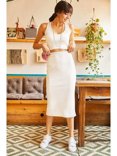 W zestawie:- 1 top- 1 spódnicaTop:- ramiączka: szerokie- dekolt: okrągły- krój: cropped- look: jednokolorowySpódnica:- wysokość pasa: high waist- pas / ściągacz: elastyczny- krój: wąski- look: jednokolorowy