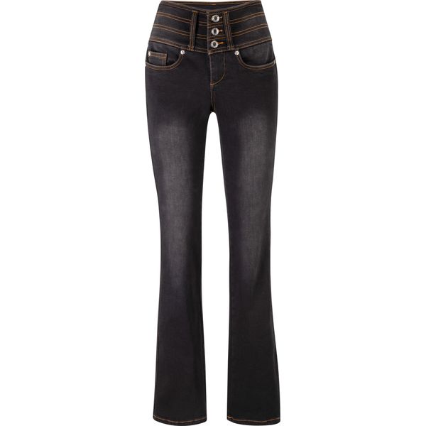 Atrakcyjne dżinsy modelujące ze stretchem z wysokim paskiem w talii. Specjalny pasek w talii wyszczupla optycznie brzuch. Przesunięty do przodu szew boczny wyszczupla nogi. Układ szwów z tyłu nadaje atrakcyjny kształt pośladkom. Podana długość jest długością przybliżoną, mierzoną od kroku. Można prać w pralce.