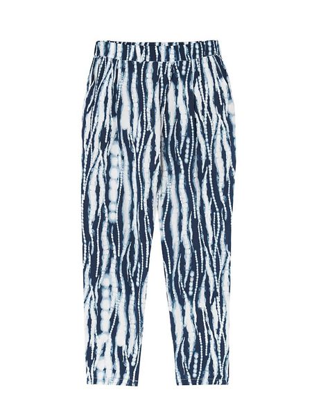 – czysta wiskoza- wysokość pasa: high waist- pas / ściągacz: elastyczny- kieszenie: wpuszczane- krój: wąski- wzór: batik