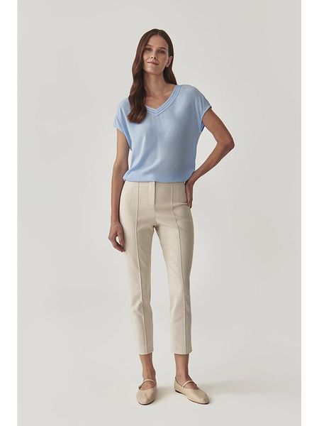 – wysokość pasa: high waist- zapięcie: haczyk i suwak- kieszenie: wpuszczane- długość nogawki: 7/8- detale: kant- krój: prosty- look: jednokolorowy