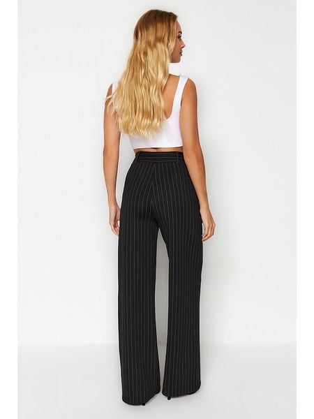 – wysokość pasa: high waist- szlufki na pasek: tak- zapięcie: haftka, guzik i zamek błyskawiczny- kieszenie: wpuszczane- krój: luźny- wzór: paski