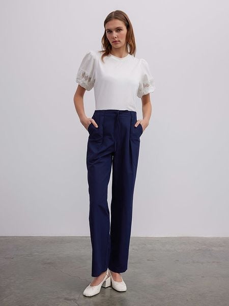 – wysokość pasa: high waist- szlufki na pasek: tak- pas: elastyczny, ściągacz tunelowy- zapięcie: guzik i suwak- kieszenie: wpuszczane- detale: kant- krój: luźny- look: jednokolorowyUwaga: Przy wyborze właściwego wariantu zaleca się korzystanie z tabeli rozmiarów.