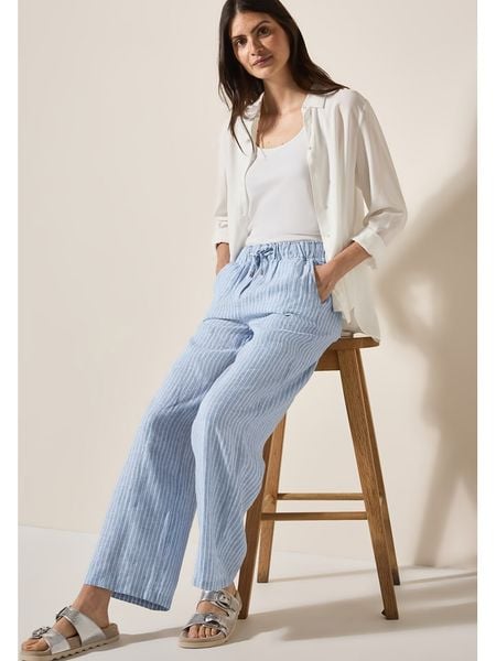 – czysty len- wysokość pasa: high waist- pas: ściągacz tunelowy- kieszenie: wpuszczane – krój: luźny- wzór: paski