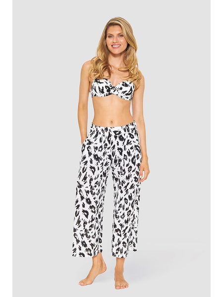 – czysta wiskoza- wysokość pasa: high waist- pas / ściągacz: elastyczny- kieszenie: wpuszczane- długość nogawki: 7/8- krój: luźny- wzór: na całości