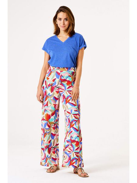 – z dodatkiem poliestru pochodzącego z recyklingu- wysokość pasa: high waist- pas / ściągacz: elastyczny- krój: prosty- zakończenia nogawek: dzwony- wzór: na całości