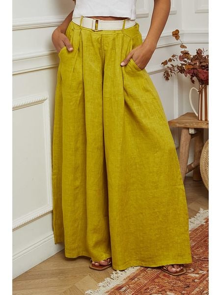 – czysty len- wysokość pasa: high waist- szlufki na pasek: tak- zdejmowany pasek: tkanina- kieszenie: wpuszczane- krój: luźny- look: jednokolorowy