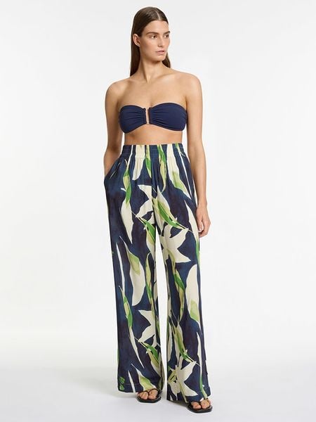 – czysta wiskoza- wysokość pasa: high waist- pas / ściągacz: elastyczny- zakończenia nogawek: dzwony- kieszenie: wpuszczane- krój: prosty- wzór: na całości