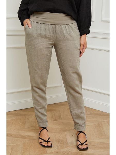– czysty len- wysokość pasa: high waist- fason: Tapered fit- krój nogawek: wąski- pas / ściągacz: elastyczny- kieszenie: wpuszczane- look: jednokolorowyWskazówka: Na metkach odzieży tej marki znajdują się rozmiary francuskie. Rozmiarówka została przez nas przeliczona. Podane do wyboru warianty rozmiarów odpowiadają standardowym europejskim rozmiarom konfekcji. Prosimy zapoznać się z zamieszczonym objaśnieniem rozmiarów: