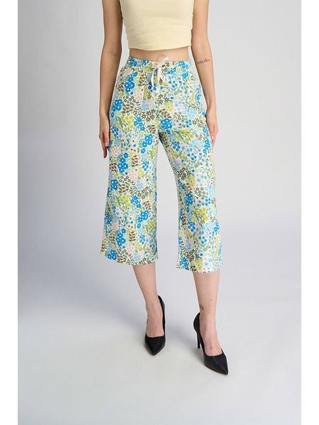 – z dodatkiem lnu- wysokość pasa: high waist- pas: ściągacz tunelowy- kieszenie: wpuszczane i tylne- długość nogawek: 3/4- krój: luźny- wzór: kwiatowy