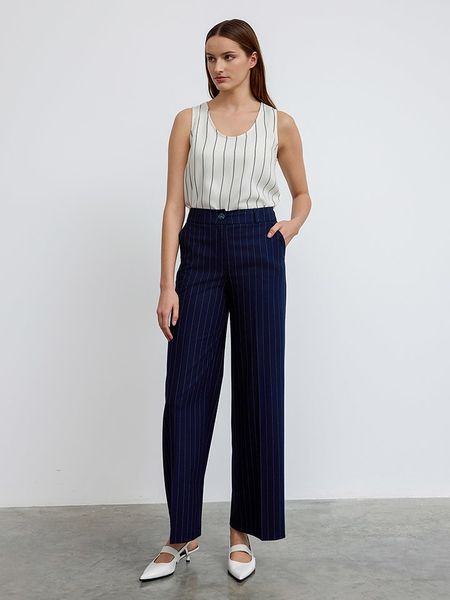 – wysokość pasa: high waist- fason: comfort fit- krój nogawek: szeroki- szlufki na pasek: tak- zapięcie: guzik i suwak- kieszenie: wpuszczane- detale: kant- wzór: paskiUwaga: Przy wyborze właściwego wariantu zaleca się korzystanie z tabeli rozmiarów.