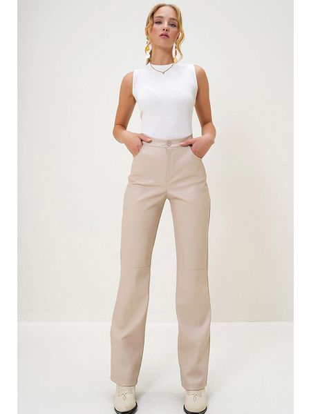– wysokość pasa: high waist- zapięcie: guzik i suwak- szlufki na pasek: tak- kieszenie: wpuszczane i tylne- detale: kant- krój: prosty- look: jednokolorowy, imitacja skóry
