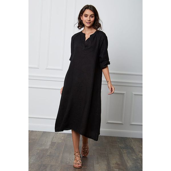 – czysty len- dekolt: z rozcięciem- zakończenie rękawa: podwijane- kieszenie: wpuszczane- detale: szydełkowana koronka- krój: luźny- look: jednokolorowy
