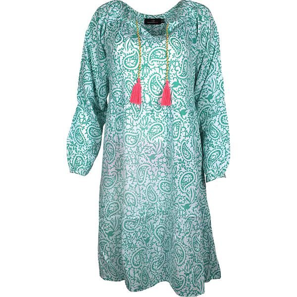 – czysta wiskoza- dekolt: V- przymocowane tasiemki: tak- rękaw: bufiasty- zakończenie rękawów: elastyczne- dolny brzeg: z falbankami- detale: chwost- krój: luźny- wzór: orientalny