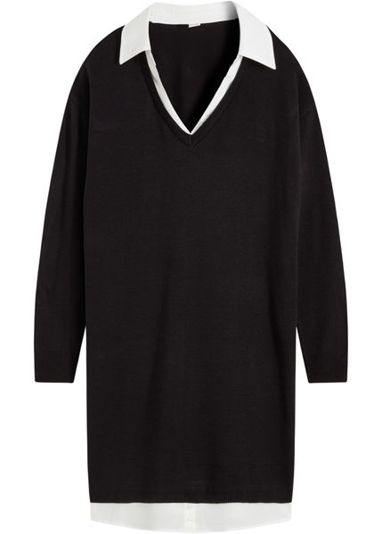 Modna sukienka dzianinowa z białą koszulową wstawką.