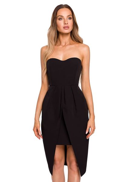 – dekolt: bandeau – zapięcie: suwak na plecach- dolny brzeg: asymetryczny – detale: zakładki – krój: taliowany – look: jednokolorowy