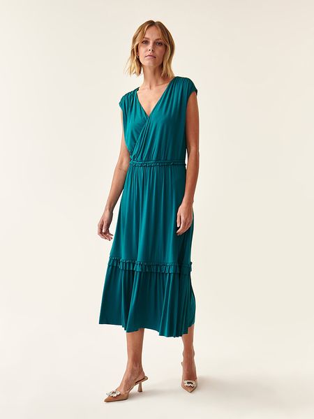 – dekolt: V- talia: marszczona- detale: falbanki- krój: taliowany- look: jednokolorowy