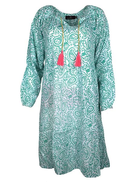 – czysta wiskoza- dekolt: V- przymocowane tasiemki: tak- rękaw: bufiasty- zakończenie rękawów: elastyczne- dolny brzeg: z falbankami- detale: chwost- krój: luźny- wzór: orientalny