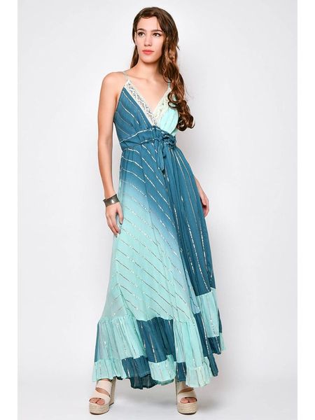 – czysta wiskoza- ramiączka: regulowane- dekolt: V- talia: ściągacz tunelowy- dolny brzeg: z falbankami- krój: litera A- nadruk: metaliczny- wzór: przejście kolorów