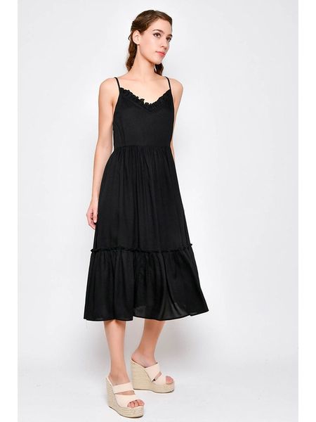 – czysta wiskoza- ramiączka: regulowane- dekolt: V- dolny brzeg: z falbankami- krój: taliowany- look: jednokolorowy