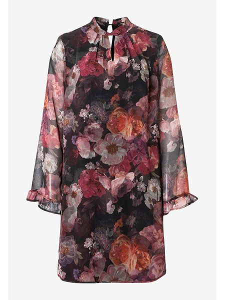 – z dodatkiem poliestru pochodzącego z recyklingu- kołnierz: stójka- zapięcie: guzik na plecach- krój: prosty- detale: falbany, wycięcia- wzór: na całości