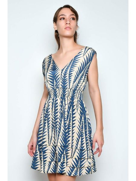 – ramiączka: szerokie- dekolt: V- talia: marszczona- krój: taliowany- wzór: graficzny