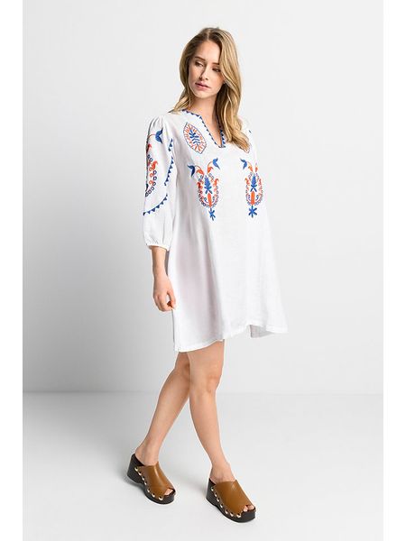– czysty len- dekolt: z rozcięciem- rękaw: bufiasty- długość rękawa: półdługi- detale: haft- krój: rozkloszowany- look: jednokolorowy