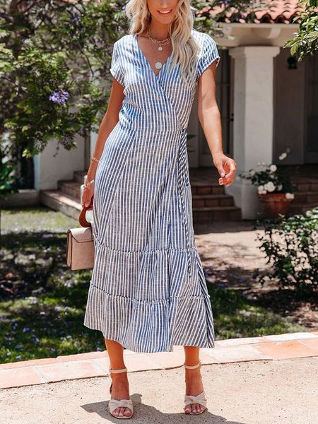 – dekolt: V- zapięcie: sznurowanie- detale: wycięcia- dolny brzeg: z falbankami- look: koperta- krój: rozkloszowany- wzór: paski