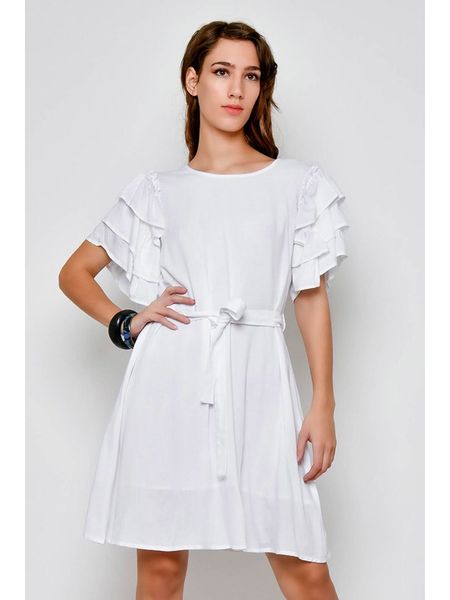 – czysta wiskoza- dekolt: okrągły- zdejmowany pasek: tkanina- detale: falbanki- krój: prosty- look: jednokolorowy
