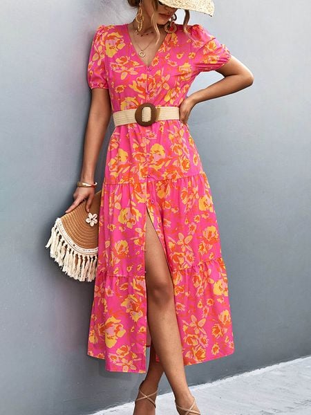 – dekolt: V- zapięcie: listwa guzikowa- rękaw: bufiasty- zakończenie rękawów: elastyczne- dolny brzeg: z rozcięciem- krój: litera A- wzór: kwiatowyUwaga: Przesyłka nie zawiera paska.