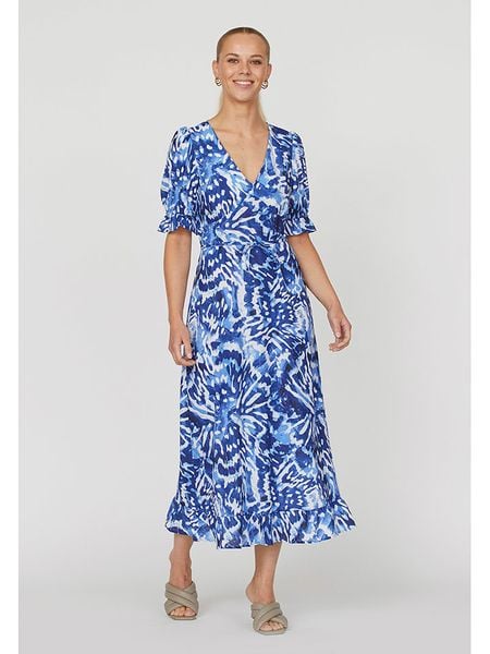 – dekolt: V- rękaw: bufiasty- w talii wiązanie: tak- dolny brzeg: z falbankami- krój: litera A- wzór: na całości