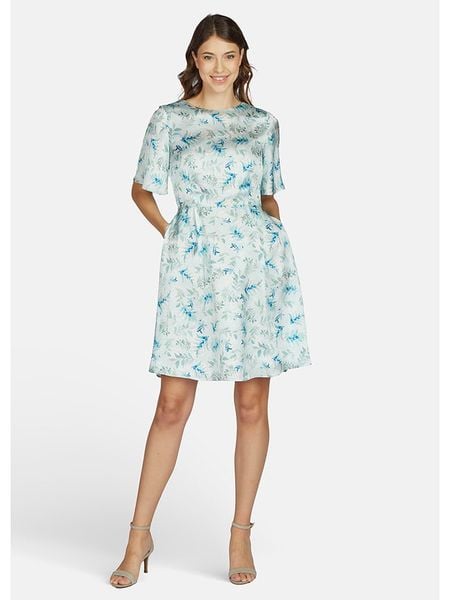 – z poliestru pochodzącego z recyklingu- dekolt: okrągły- zapięcie: suwak na plecach- krój rękawów: motylek- kieszenie: wpuszczane- krój: litera A- wzór: na całości