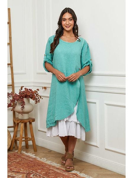 – czysty len- dekolt: okrągły- zakończenie rękawów: patka i guzik- dolny brzeg: z falbankami- krój: luźny- wzór: colour blocking