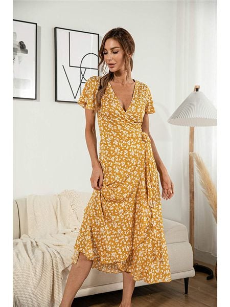 – dekolt: V- krój rękawów: motylek- dolny brzeg: z rozcięciem- detale: ozdobne wiązanie- krój: litera A- wzór: kwiatowy
