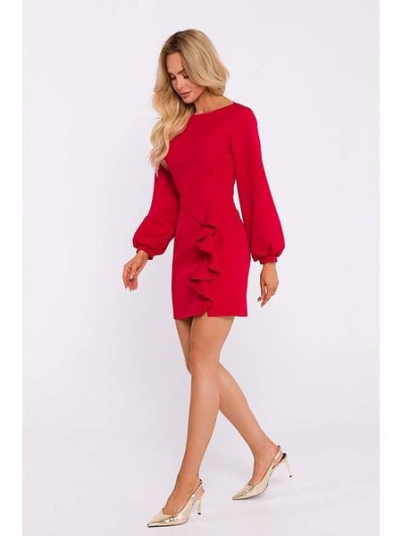 – dekolt: łódka- zapięcie: suwak na plecach- rękaw: bufiasty- detale: falbany- krój: taliowany- look: jednokolorowy
