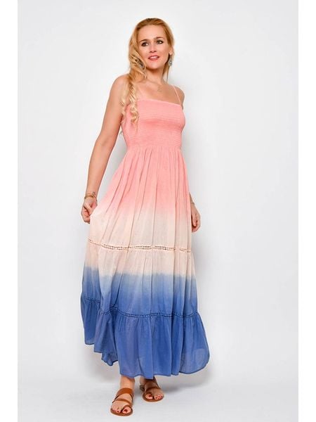 – czysta bawełna- ramiączka: regulowane- dekolt: karo- górna część: marszczona- dolny brzeg: z falbankami- krój: litera A- wzór: przejście kolorów