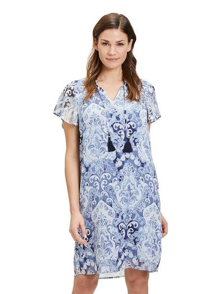 – dekolt: z rozcięciem- zapięcie: wiązane tasiemki- krój rękawów: motylek- krój: prosty- wzór: na całości