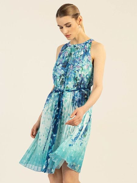 – ramiączka: szerokie- dekolt: okrągły- zapięcie: guzik na plecach- szlufki na pasek: tak- zdejmowany pasek: tkanina- krój: litera A- wzór: kwiatowy- look: plisy