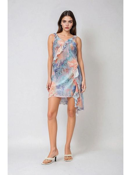 – ramiączka: szerokie- dekolt: V- dolny brzeg: z rozcięciem- detale: ozdobne wiązanie, falbany- krój: prosty- wzór: na całości