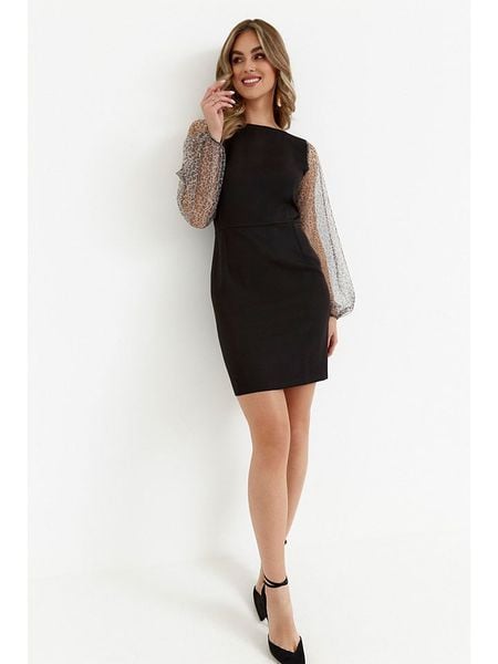 – dekolt: łódka- zapięcie: suwak na plecach- rękaw: bufiasty- detale: tiul- krój: taliowany- look: jednokolorowy