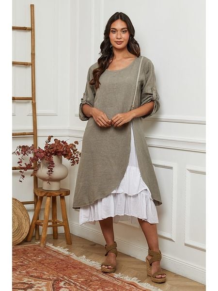 – czysty len- dekolt: okrągły- zakończenie rękawów: patka i guzik- dolny brzeg: z falbankami- krój: luźny- wzór: colour blocking