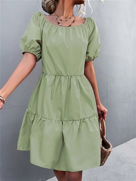– dekolt: okrągły- rękaw: bufiasty- zakończenie rękawów: elastyczne- talia: elastyczna- dolny brzeg: z falbankami- krój: luźny- look: jednokolorowyUwaga: Przesyłka nie zawiera paska.