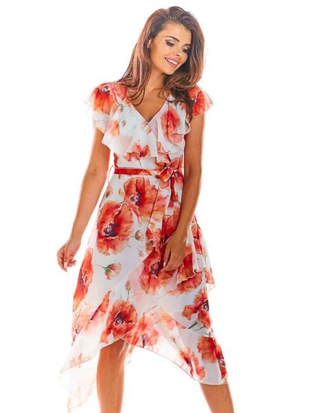 – dekolt: V- zdejmowany pasek: tkanina- detale: falbany- krój: luźny- wzór: kwiatowy