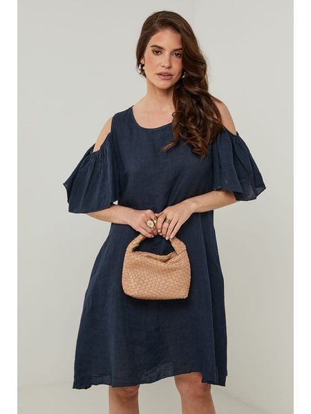 – czysty len- dekolt: okrągły- zapięcie: guzik na plecach- krój rękawów: motylek- detale: wycięcia- krój: luźny- look: jednokolorowy