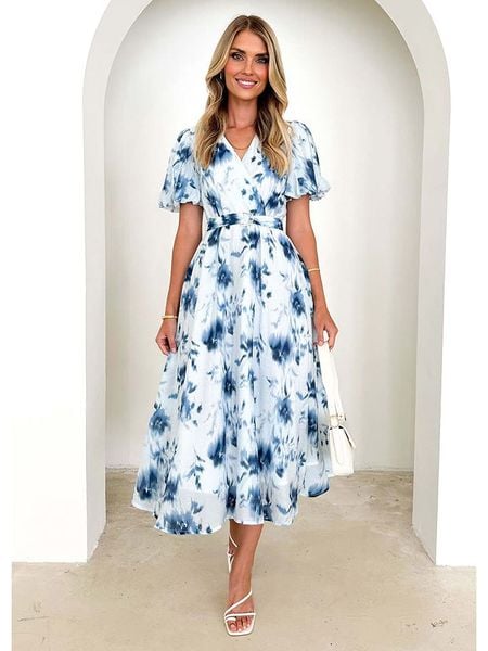 – dekolt: V- zapięcie: suwak na plecach- rękaw: bufiasty- zakończenie rękawów: elastyczne- szlufki na pasek: tak- zdejmowany pasek: tkanina- krój: litera A- wzór: kwiatowy