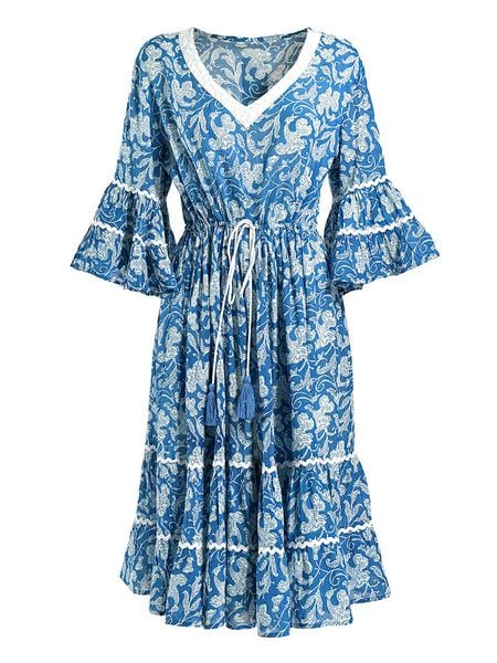 – czysta bawełna- dekolt: V- długość rękawa: 3/4- talia: ściągacz tunelowy- krój: rozkloszowany- wzór: na całości