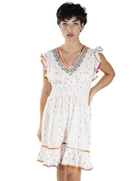 – czysta bawełna- dekolt: V- krój rękawów: motylek- talia: marszczona- dolny brzeg: z falbankami- detale: aplikacje- krój: taliowany- wzór: na całości