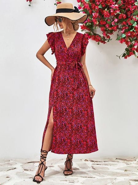 – dekolt: V- krój rękawów: motylek- szlufki na pasek: tak- zdejmowany pasek: tkanina- dolny brzeg: z rozcięciem- krój: litera A- wzór: na całości