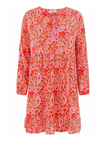 – czysta wiskoza- dekolt: okrągły- zapięcie: skrócona listwa guzikowa- zakończenie rękawów: elastyczne- dolny brzeg: z falbankami- detale: ozdobne wiązanie- krój: prosty- wzór: orientalny